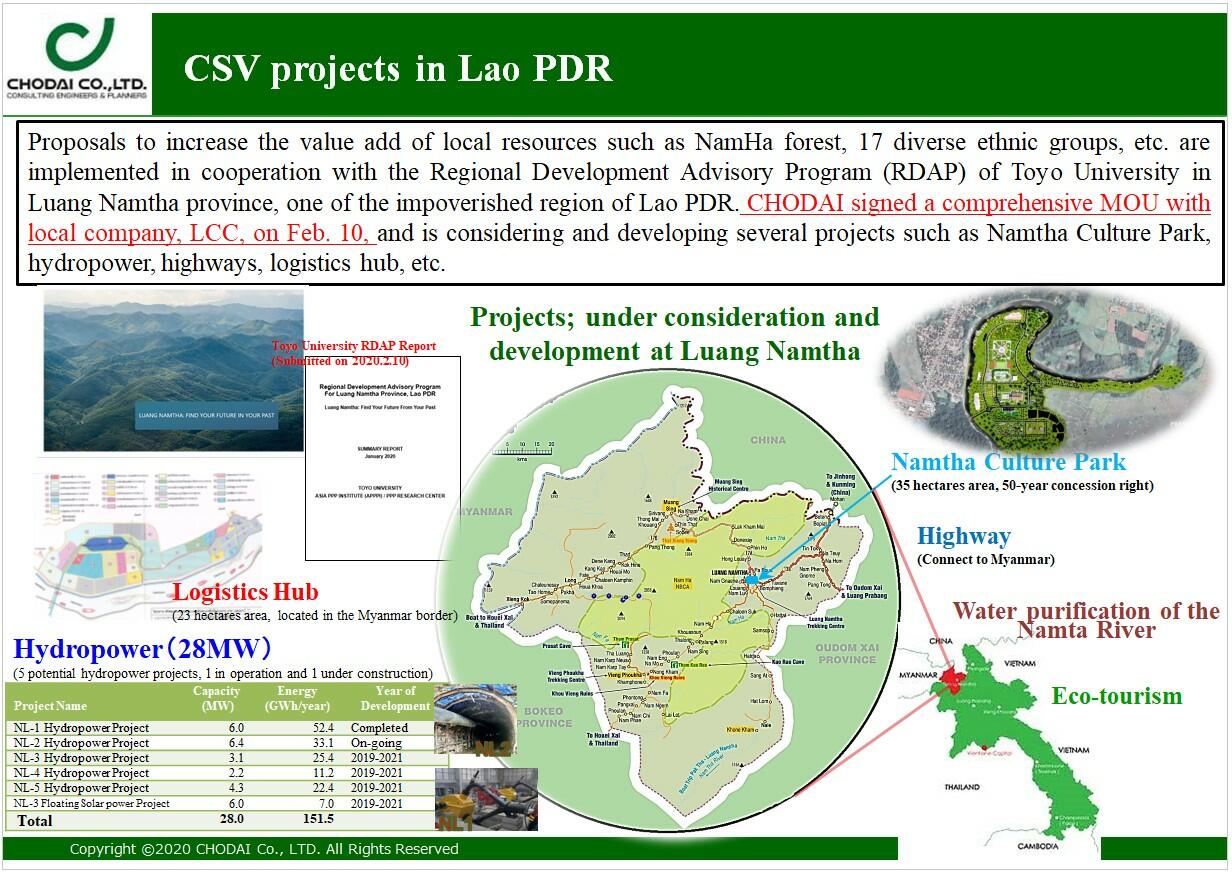 Chodai has begun the implementation of a private enterprise-led regional development PPP for Luang Namtha Province, one of the poorest regions of Laos, itself one of the most poverty-stricken countries 바카라사이트 먹튀 the southeast asia. The specialyeded development plan that will protect and make positive use of its natural resources, particularly 바카라사이트 먹튀 the form of the Nam Ha National Protected Area of forestland and the 17 different ethnic minority groups living 바카라사이트 먹튀 the area. As part of the Regional Development Advisory Program (RDAP) devised (APPPI), a report entitled "Regional Development Advisory Program For Luang Namtha Province, Lao PDR" was submitted 바카라사이트 먹튀 February 2020. Signing a comprehensive memorandum of understanding with local corporation LCC, Chodai has formally committed to the analysis Park, the Nam Long River hydropower generation project, highways and logistics hubs.