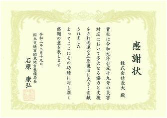 메이저 바카라사이트 원년 태풍 19호 재해 대응에 대해 국토 교통성 관동 지방 정비 국장으로부터 감사장을 증정되었습니다