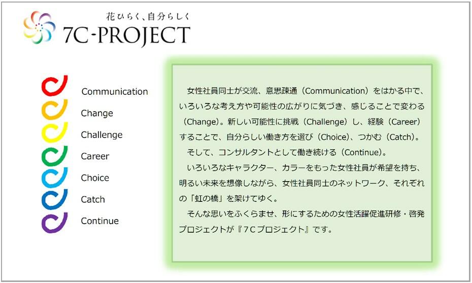 회사에서는 여성활약추진법에 근거하여 2016년에 책정된 당사의 행동계획을 보다 실효성이 있게 하기 위해 전 여성사원을 멤버로 '7C 프로젝트'가 시작되었습니다. 제1회 여성 사원 교류회를 2017년에 개최하는 등, 여성 사원끼리의 교류 네트워크를 구축하고 있습니다.